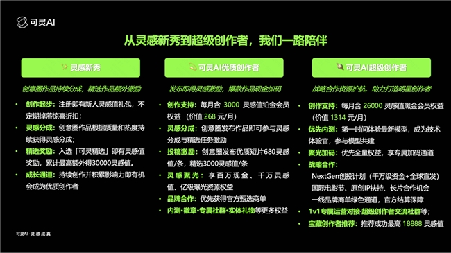 原有的「超级创作者」与「优质创作者」也持续加码。优质创作者每月可获赠价值268元的铂金会员,算力无忧,随意创作,在创意圈发布的精选投稿还可获得每条3000灵感值,解锁「灵感聚光计划」。超级创作者则每月可享受价值1314元的黑金会员,更可获得战略级合作资源,包括NextGen创投千万级资金的绿色通道、国际电影节展映机会、长片计划合作,以及1v1专属运营对接等。